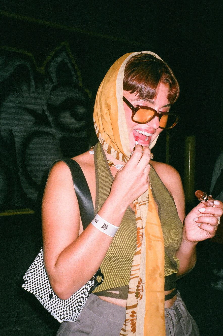 Before starting AZYR Specs (the palendrome of Ryza), her career zigzagged wildly. After studying Sports Broadcast Journalism in Missouri, she up and moved to New York to work as a stylist on projects for folks like Kid Super and Eli Manning, then to costume design on Law & Order, to bartending at Bowery Ballroom, at one point she was living on a cruise somewhere in the Caribbean. A night out with her has similar qualities. An innocent dinner date will ends with us thumping a kebero on a stage in Flatbush.